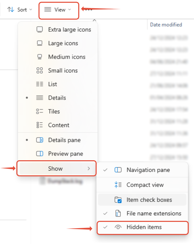 - 「表示」に移動し、「非表示のアイテム」をクリックします